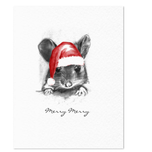 Stay connected with friends & family near & far - send a fun, cheery Holiday card featuring Emer’s charcoal drawn mouse with a watercolored Santa hat. Regular postage.